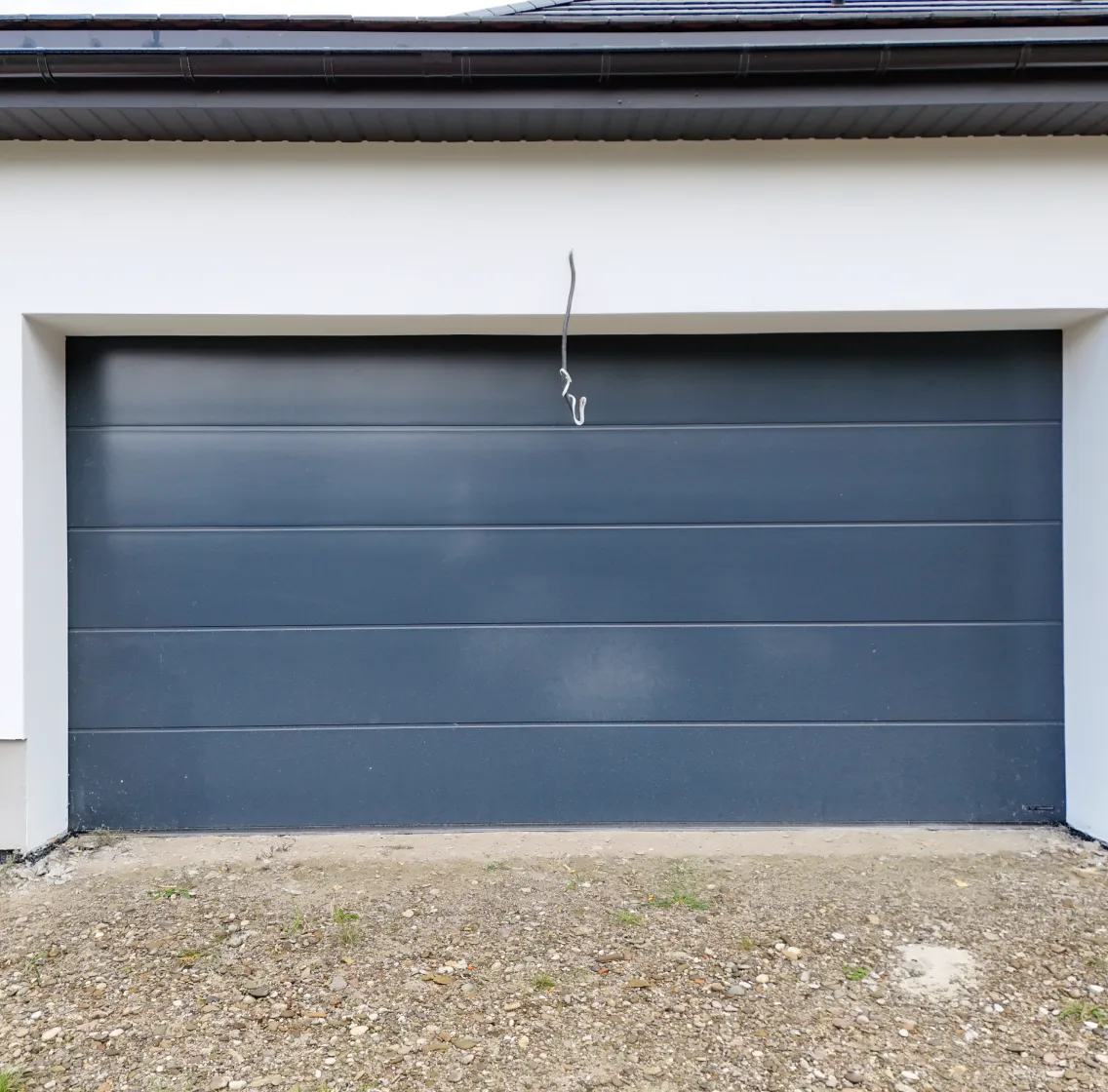 Stolarka została zamontowana na podwalinach PURENIT oraz w technologii szczelnego montażu z użyciem taśm SIGA, co gwarantuje wysoką energooszczędność i trwałość połączeń. Całość uzupełnia brama garażowa Wiśniowski Unitherm oraz żaluzje fasadowe, chroniące wnętrza przed słońcem. Wszystkie elementy wykonano w kolorze RAL 7016 – antracyt, tworząc nowoczesną i elegancką bryłę.